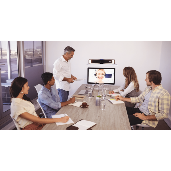 In a compact design, the AVer VB130 fits on top of a 17-inch monitor or can be mounted on a tripod. This device promotes contactless meeting technology for safer, more efficient meetings with SmartFrame, AI-triggered, contactless viewing angle settings designed to perfectly frame meeting participants, no matter how far from the lens.