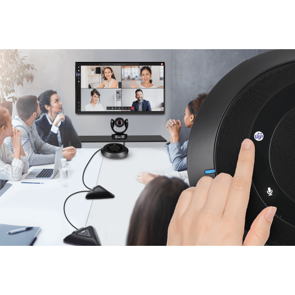 You can extend your table/room coverage with additional speakers: up to 3 cascading (enhance listening and amplify voice)