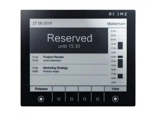 At first glance, it could be confused with the digital version of the old paper screen on the meeting room door. touch screen and its access to the network, it becomes an interactive terminal: you can modify the data displayed or schedule a meeting on the fly, without having to return to your table.