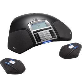 A conference phone includes advanced microphone and speaker technology and often USB, Bluetooth or DECT interfaces to connect multiple people in simultaneously.
