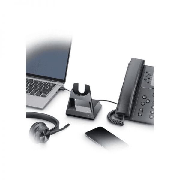 It is compatible with all headsets in the Voyager 4300 UC range and with the Voyager Focus 2 range