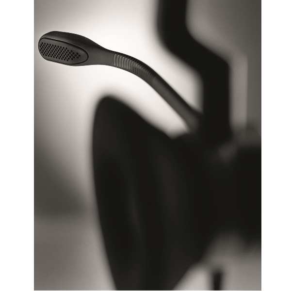 The air shock microphone, which can be positioned right next to the mouth of the user, has been designed aerodynamically to prevent the sound of the user breathing being heard.