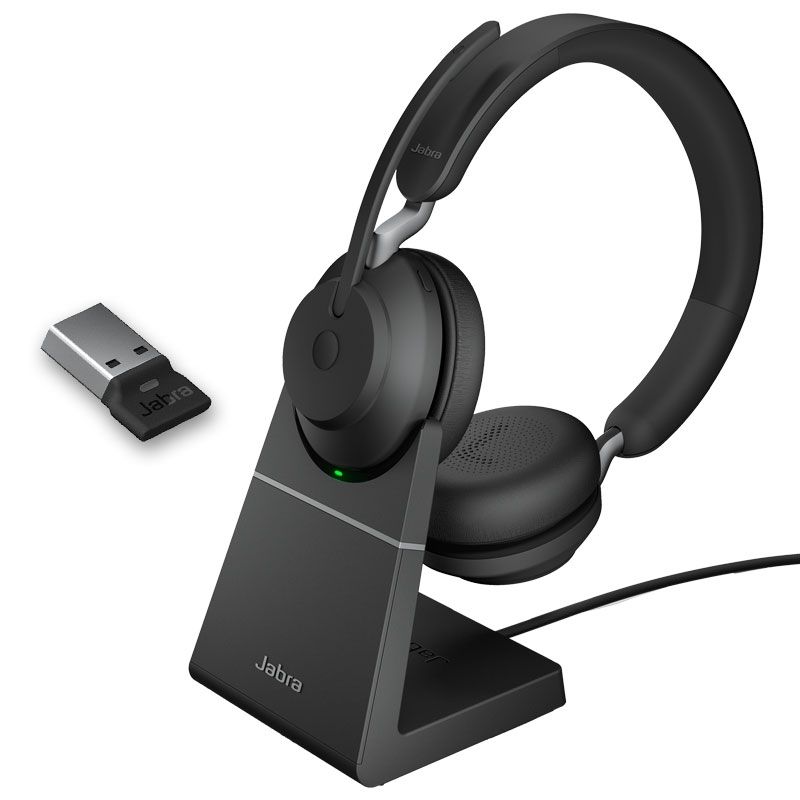 Jabra Evolve2 65 USB-A UC Duo is a wireless headset for PC and smartphone with dual Bluetooth connection dongle USB-A.