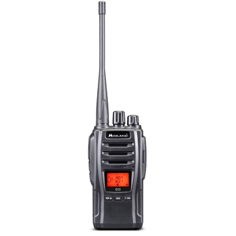 Related guides Product Specs. Midland G13 Manufacturer part # C1462 EAN 8011869203862 Warranty 2 years Main filters Professional, Resistant Frequency License-free Use For intensive use ATEX certified Without ATEX certification Lone worker protection No IP Rating IPx4 VOX/iVOX hands free With earpiece Standby time / Talk time /40h Battery 2600mAh Scan function With scan function LTE No Size 11,7 x 6 cm Connector accessory 2pin Kenwood