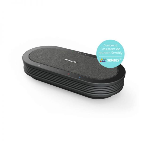 Affiliated with Philips' Smart Meeting range, the PSE0501 is a wireless conference microphone ideal for medium to large rooms. All softphone compatible, it makes it easy to take with you to conference in the office, at home or on the move thanks to its compact size. Capable of detecting up to 12 speakers, it packs 6 digital microphones with noise filtering, the latter capable of transcribing all voices present at 360° within a radius of 6 metres. Thanks to the 4 built-in speakers, you get crystal clear sound diffusion for your hybrid exchanges.