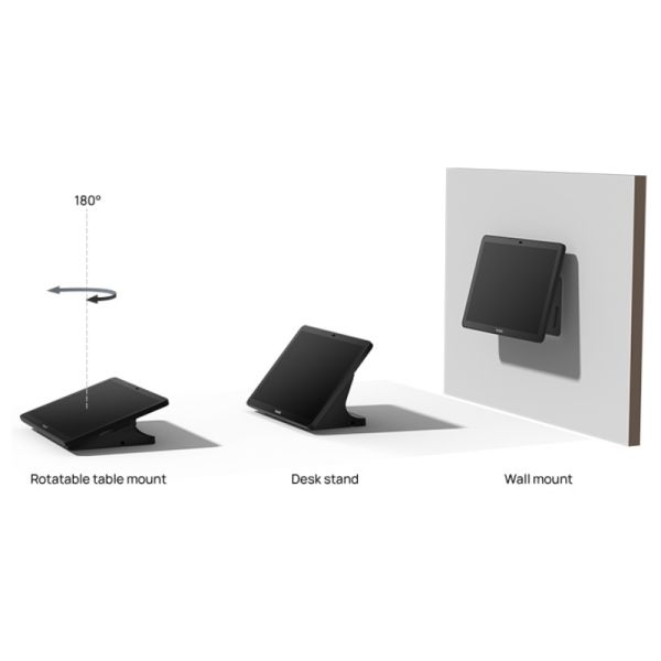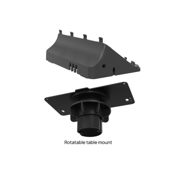 The kit includes four components with varying dimensions: low and high desk stands, a wall mount, and a table lock kit. It offers physical flexibility for installation depending on the workspace. All items are compact and durable.