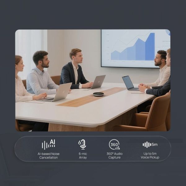 Equipped with 6 omnidirectional microphones offering 360° voice pickup, it ensures everyone is heard clearly, even in medium-sized meeting rooms (up to 4 participants). You can also daisy-chain up to two units for larger spaces, without complicated setup.